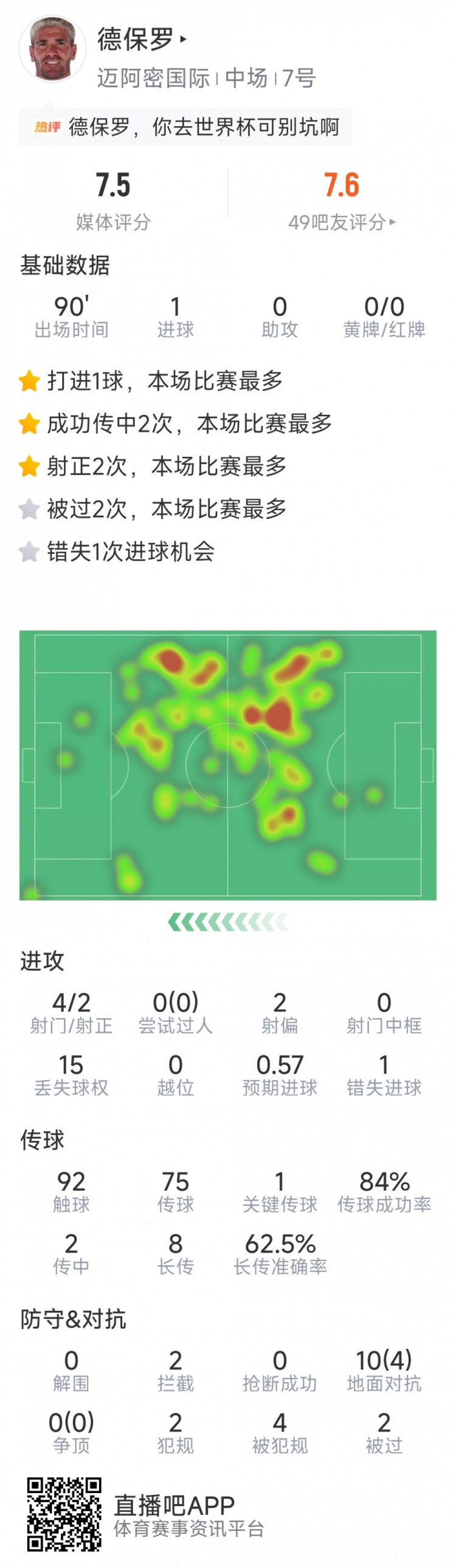 德保罗本场数据:1粒进球,4射2正,1次错失良机,1次关键传球